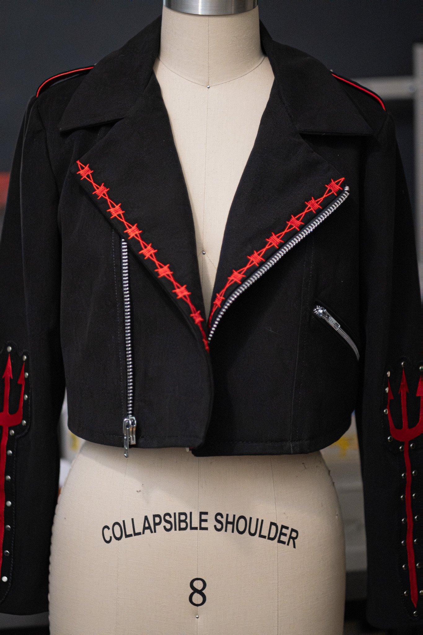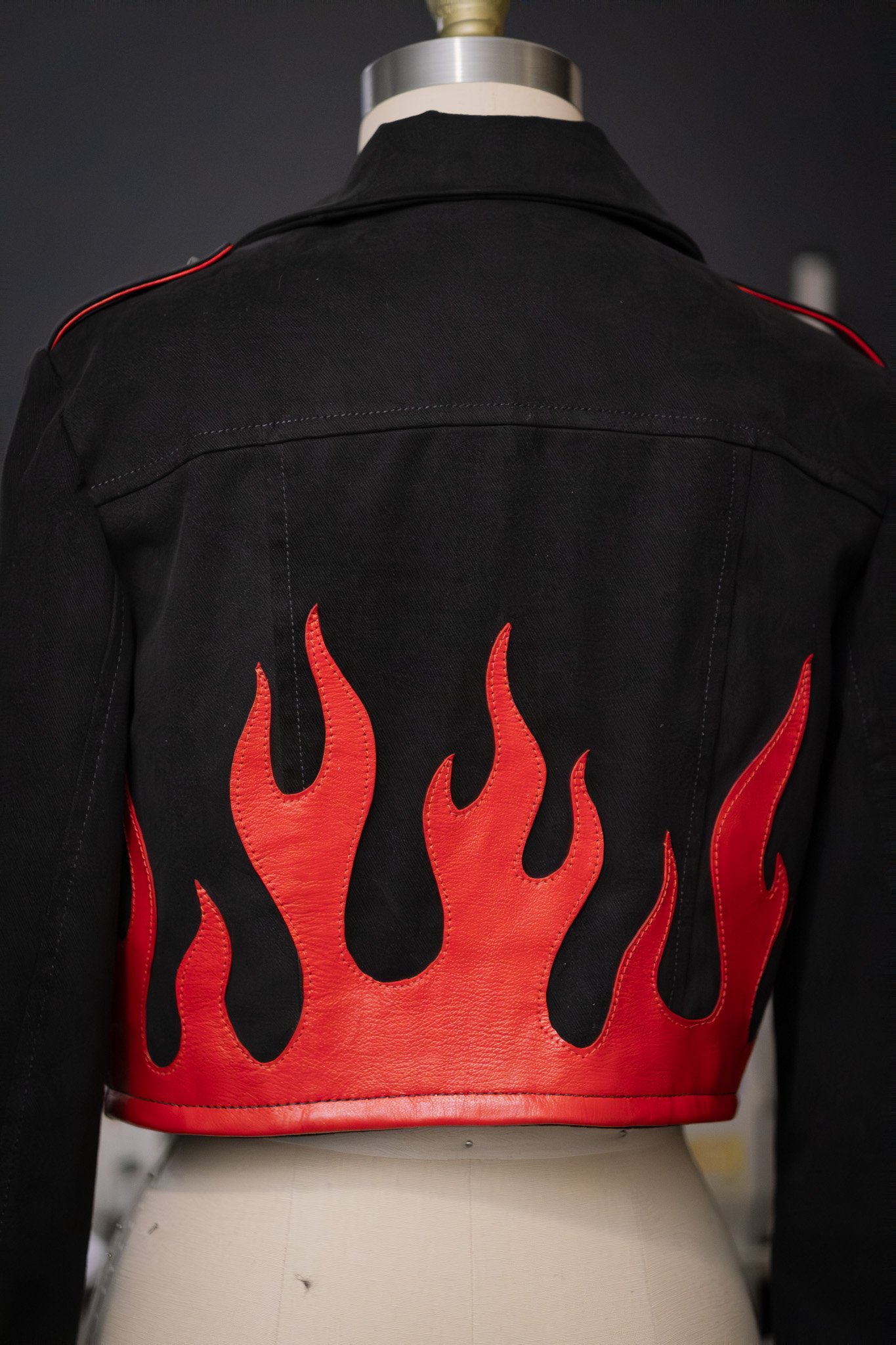 Embroidered and studded details. Hand cut leather flames applique on back.