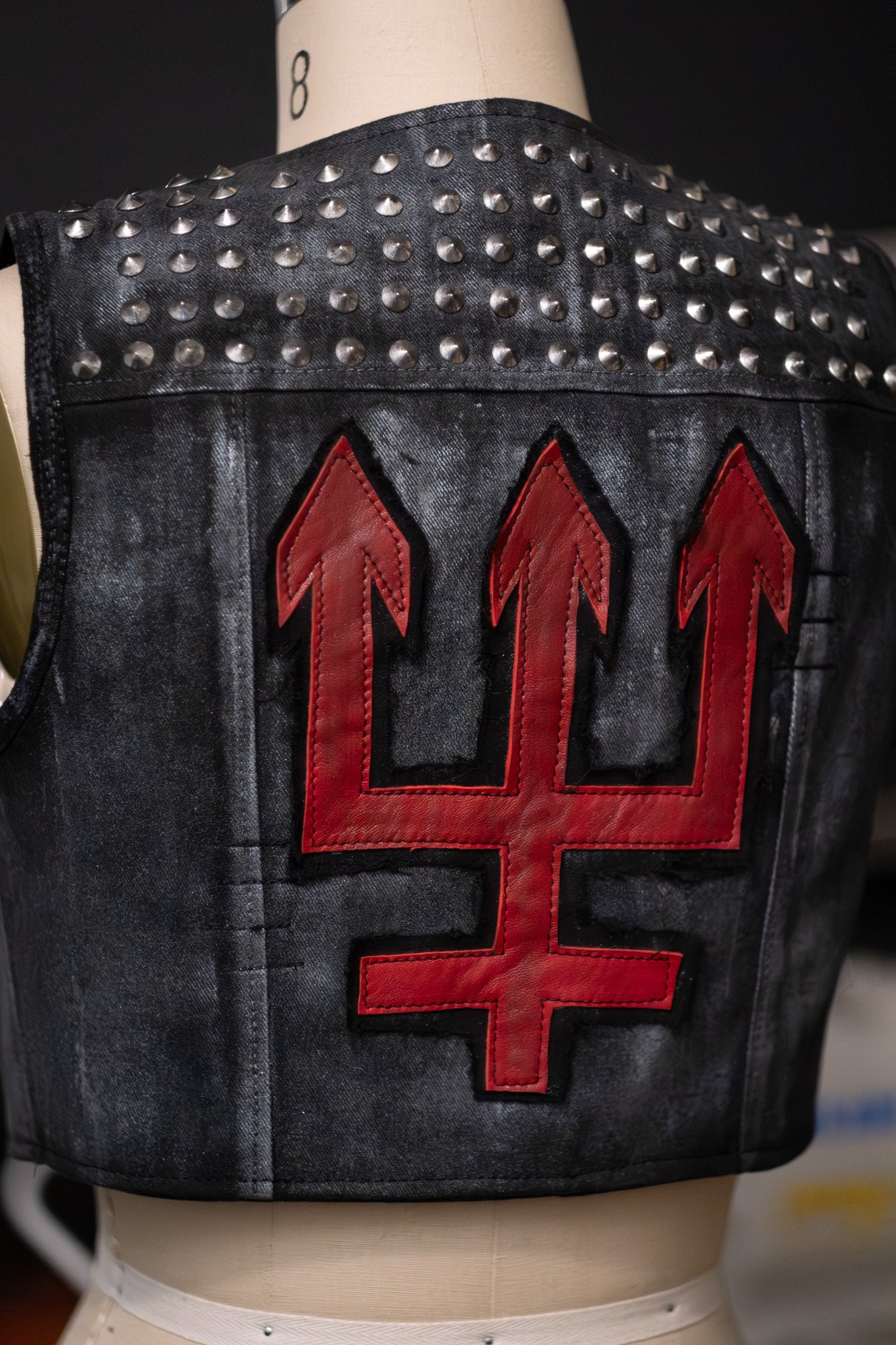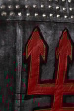 Painted and sanded cotton denim, with leather applique and studded back panel. Embroidered patch on front. Fully lined.